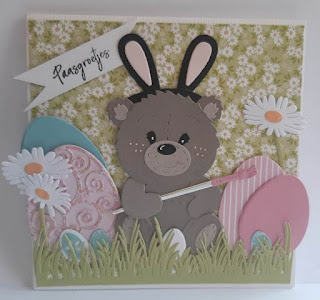 Hallo allemaal, ik heb nog een paaskaartje gemaakt. Ik heb Ted konijnen oren gegeven, deze gemaakt met een oudere collectables konijn, vond de mal van Craft lab echt iets te duur hoor,